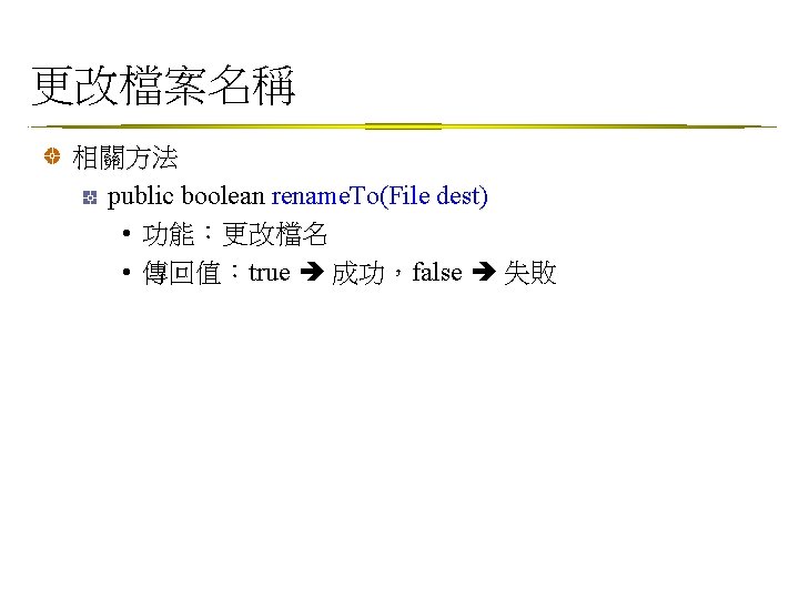 更改檔案名稱範例 Example: Rename. File. java File fs = new File(args[0]); File fd = new File(args[1]); if ( fs. exists() ) { if ( !fd. exists() ) { if (fs. rename. To(fd)) { System. out. println(fs. get. Name() + " --> " + fd. get. Name()); System. out. println("1 file(s) has been renamed!"); } } else System. out. println("Target name already exists!"); } else System. out. println("Wrong source name!");