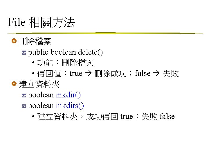 建立資料夾範例 Example: Make. Dir. java import java. io. *; public class Make. Dir { public static void main(String[] args) { File dir = new File(args[0]); if ( !dir. exists() ) { boolean success = dir. mkdir(); // boolean success = dir. mkdirs(); System. out. println("Create "+dir+" is successed!!"); } else System. out. println(dir + " is already exist!!!"); } }
