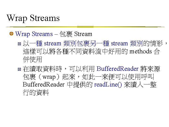 How to Wrap a Stream 想計算檔案中的行數 a. 查 class File. Read ->沒有這種功能 -> 自己寫? ? ? b. 又查到 class Buffered. Reader中有 public String read. Line() throws IOException 怎麼辦? ? ->包裝File. Reader使成Buffered c. 查Buffered. Reader的Constructor Buffered. Reader (Reader in)