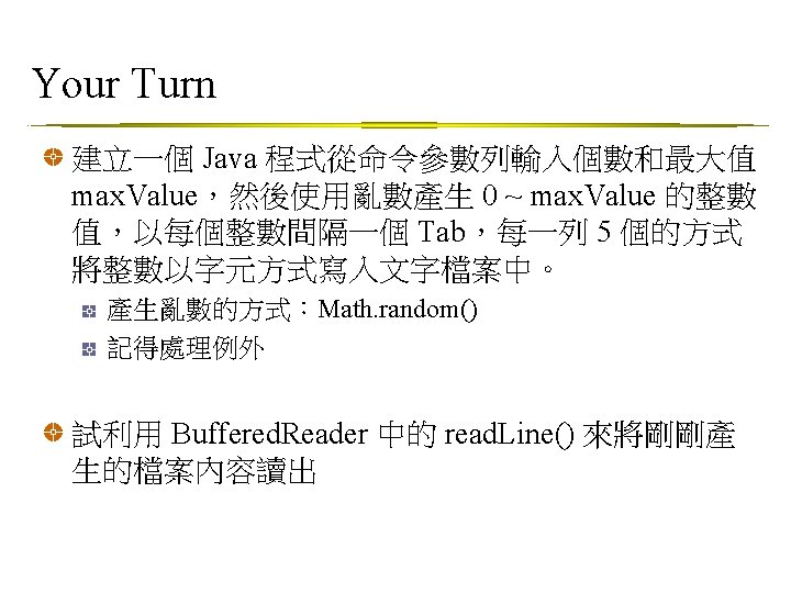 為何Java如此大費周章 使用Buffered. Reader為何還要先產生File. Reader,再 指向檔案名稱? Buffered. Reader br = new Buffered. Reader(new File. Reader(“Test. txt”)); 因為 Buffered. Reader 和 Buffered. Writer 不只可以做檔案處 理之功能 只需置換 Buffered. Reader 之建構子,即可使用相同的API 做出讀取鍵盤輸入和網路傳輸等功能 請注意 Buffered. Reader 和 Buffered. Writer 的建構子 為 Reader 和 Writer 之類別