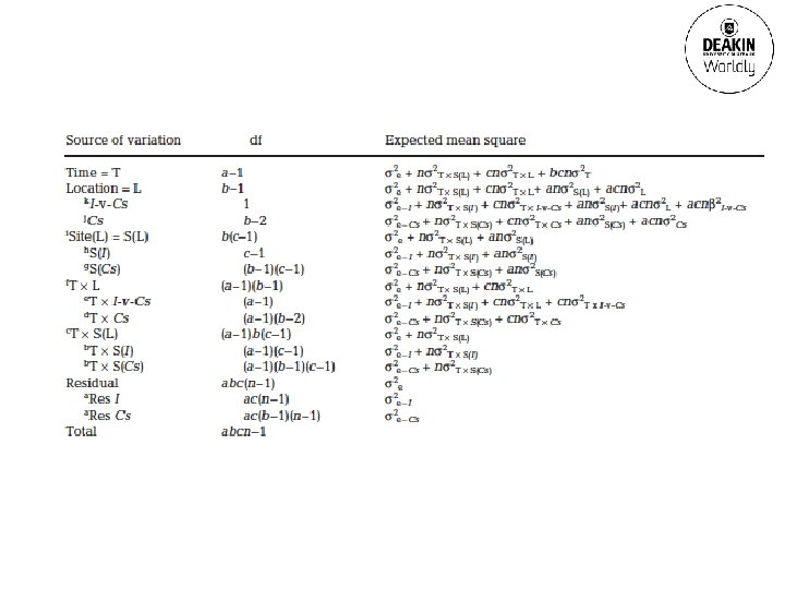 Impact assessment • Does sessile marine animal community composition vary between sewage impact and control sites? – 3 control and 1 impact locations – 4 randomly chosen times – replicate sites and photographic quadrats at each location • Percent cover of 58 taxa • Classical “beyond” BACI design – split-plot type linear model • Terlizzi et al (2005) http: //www. conisma. it/total/t_aim. html
