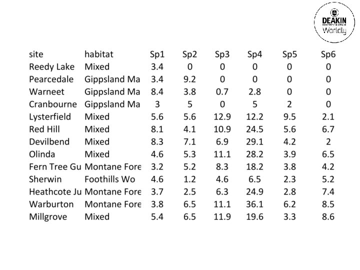 Multivariate analysis in community ecology Gerry Quinn Deakin