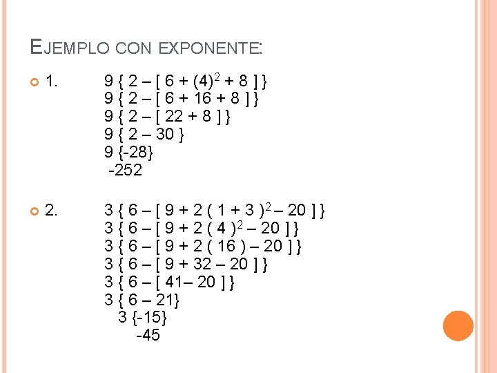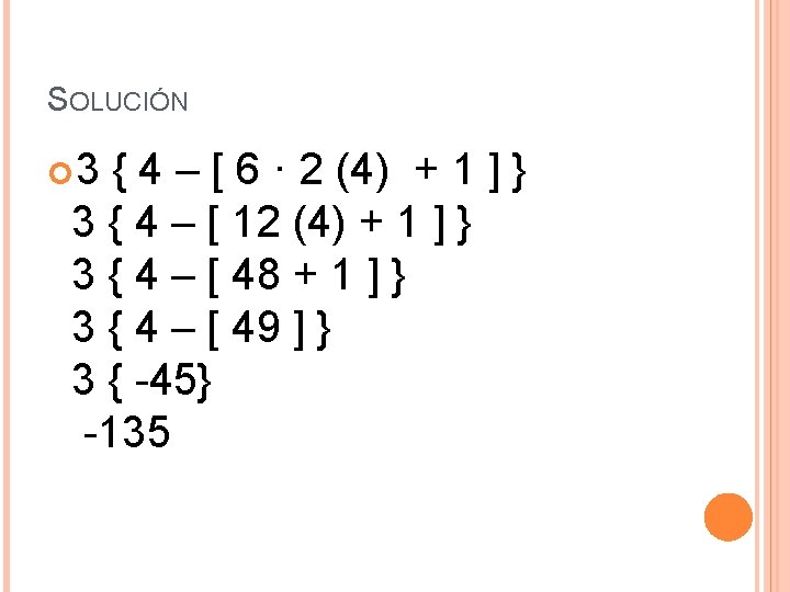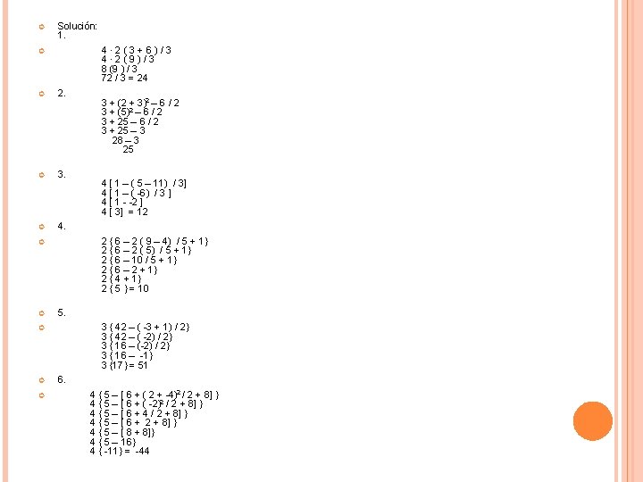 Ejemplo: 5 · (9 – 6) + 8 <Se resuelve el paréntesis> 5 · 3 + 8 < Se restó 9 – 6 = 3> 15 + 8 < Se multiplicó 5 · 3> 23 < Se sumó 15 + 8> Otro ejemplo: 2 [ 6 · (-1)] + 8 / 2 <Primero, se resuelve el [ ] > 2 [ -6] + 8 / 2 < Se multiplicó 6 · -1> -12 + 8 / 2 < Se multiplicó 2 · -6> -12 + 4 < Se dividió 8 / 2> -8 < Se sumó – 12 + 4> Cuando hay una combinación de paréntesis, corchetes y llaves, hay que resolver éstos de adentro hacia fuera.