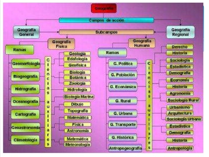 Disciplinas que colaboran con la Geografía • • Biología Botánica Zoología Agronomía Topografía Meteorología Estadística Demografía • • • Historia Sociología Psicología Astronomía Física Matemáticas Química Biología Arquitectura Dibujo