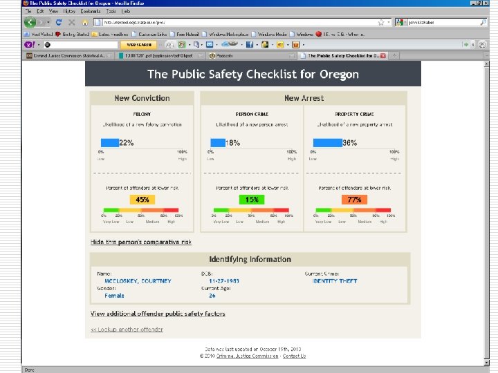 Why does risk matter in sentencing? o Examine property offenders from 2005 -2007 o Examined their risk of being reconvicted of a felony o Overlap where some high risk property offenders were sentenced to prison and some low risk property offenders were sentenced to probation o By using risk at sentencing it is possible to save prison beds while keeping crime constant or to reduce crime while keeping beds constant 31