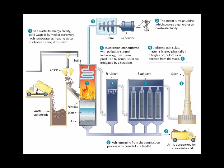 Incinerators • A controlled process in which mixed garbage is burned at very high temperatures. – Pollution control removes most pollutants from emissions. – Burnable vs. Nonburnable waste is NOT separated – Reduces weight of waste by 90% – Reduces volume of waste by 75% • Ashes are taken to landfill and occupy less space