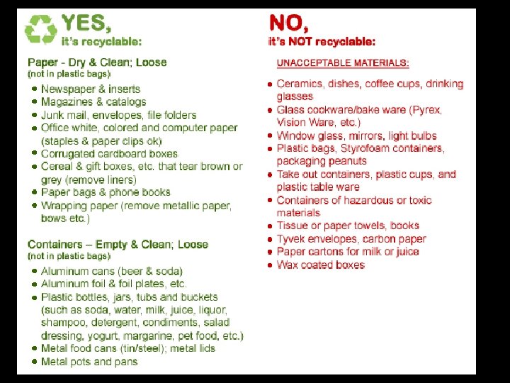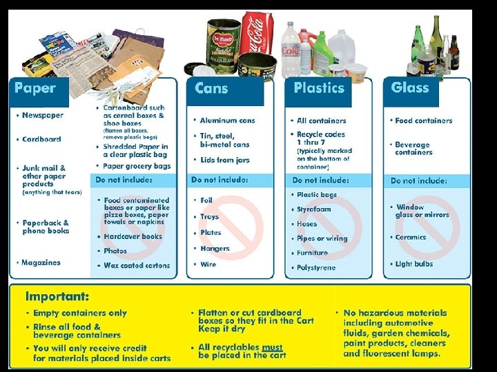 Waste Reduction Methods • Substitute disposable goods with reusable ones. • Donate unwanted items. • Minimize packaging. • Reduce use of nonbiodegradable plastic. • Design goods to last. • Use financial incentives such as “pay as you throw” garbage disposal and “bottle bills. ” • BUY LESS!!!