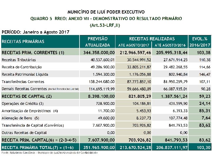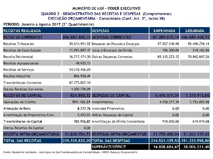 BALANÇO ORÇAMENTÁRIO CLASSIFICAÇÃO DAS RECEITAS: RECEITA CORRENTE: Aquela oriunda da arrecadação de tributos (próprios e de transferências), contribuições sociais e econômicas, serviços, cobrança da dívida ativa e outras, destinadas a atender despesas correntes. RECEITA DE CAPITAL: Aquela proveniente da venda de bens e direitos, da realização de operações de crédito (empréstimos) e de convênios, destinadas à realização de despesas de capital. RECEITA INTRA-ORÇAMENTÁRIA: Aquela decorrente de operações entre os orçamentos dos entes integrados do Poder Público. ________________________________________ _ MUNICÍPIO DE IJUÍ – PODER EXECUTIVO 04 | slide SECRETARIA MUNICIPAL DA FAZENDA AUDIÊNCIA PÚBLICA | EXECUÇÃO ORÇAMENTÁRIA E GESTÃO FISCAL | 2° QUADRIMESTRE 2017
