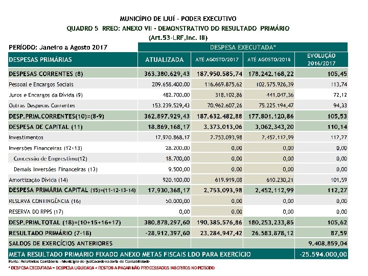 BALANÇO ORÇAMENTÁRIO CLASSIFICAÇÃO DAS DESPESAS: DESPESA CORRENTE: Aquela destinada à gastos com pessoal e encargos, juros e encargos da dívida, material de consumo, serviços e encargos diversos; ou seja, gastos de manutenção de atividades e projetos. DESPESA DE CAPITAL: Aquela destinada a Investimentos como obras e instalações e a aquisição de equipamentos e materiais permanentes; Inversões Financeiras como aquisição de ações/quotas partes de empresas e concessão de empréstimos; e, Amortização de Dívidas. DESPESA INTRA-ORÇAMENTÁRIA: Aquela decorrente de operações entre os orçamentos dos entes integrados do Poder Público. ________________________________________ _ MUNICÍPIO DE IJUÍ – PODER EXECUTIVO 06 | slide SECRETARIA MUNICIPAL DA FAZENDA AUDIÊNCIA PÚBLICA | EXECUÇÃO ORÇAMENTÁRIA E GESTÃO FISCAL | 2° QUADRIMESTRE 2017