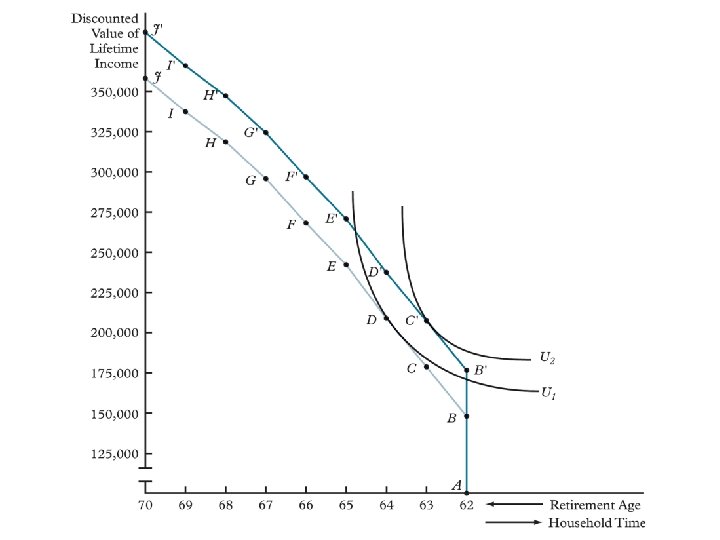 Nyugalomba vonulás megválasztása Mitől függ? • A hátralévő várható időre rendelkezésre álló összjövedelem jelenértéke • A fenti összeg változása a nyugdíjba vonulás elhalasztásával • Preferenciák a háztartási munkára/szabadidőre és a keresetből vásárolható javakra