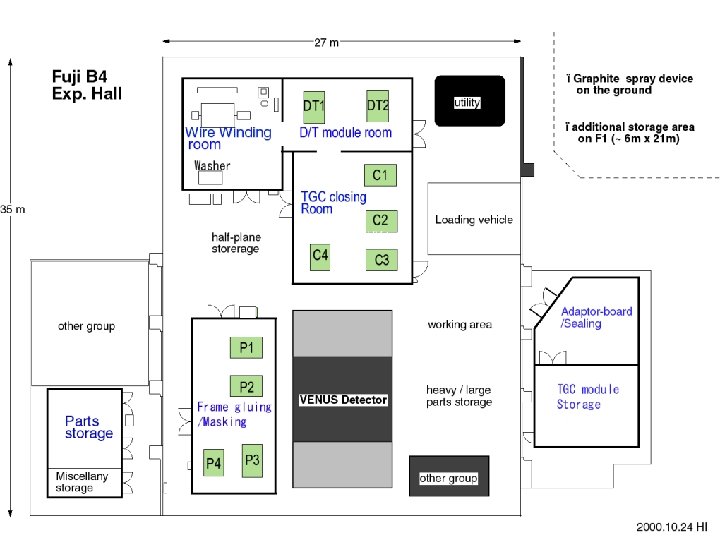 Wire winding Washing machine: Øto remove some dusts on the cathode plane by mist. ØWashing away the solder flux with ultrasonic cleaning Ø(water-soluble flux is used) Wire winding machine ü Consists of a linear actuator and a rotating table. Mist sprayer ü Total ~ 800, 000 wires Anode Wire: Gold plated Tungsten (A. L. M. T. co. Ltd. ) Solder: Sn(80)+Zn(20) • Flux: Water soluble flux Ultrasonic wave
