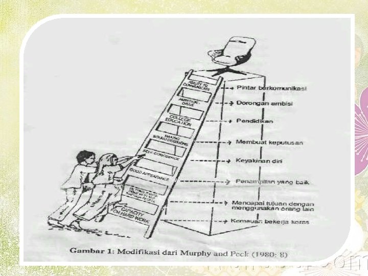 Murphy and Peck 8 anak tangga untuk mencapai puncak karier digunakan oleh seorang wirausaha dlm mengembangkan profesinya Pandai berkomunikasi (ability to communicate) Ambisi untuk maju (ambition drive) Mau menambah ilmu pengetahuan (college education) Pandai membuat keputusan (making sound decision) Yakin (self confidence) Penampilan yang baik (good appearance) Bekerjasama dengan orang lain (getting things done with and trough people) Mau bekerja keras (capacity for hard work)