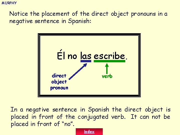 MURPHY Notice the placement of the direct object pronouns in a negative sentence in Spanish: Él no las escribe. direct object pronoun verb In a negative sentence in Spanish the direct object is placed in front of the conjugated verb. It can not be placed in front of “no”. index