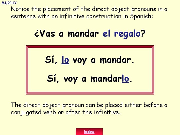 MURPHY Notice the placement of the direct object pronouns in a sentence with an infinitive construction in Spanish: ¿Vas a mandar el regalo? Sí, lo voy a mandar. Sí, voy a mandarlo. The direct object pronoun can be placed either before a conjugated verb or after the infinitive. index