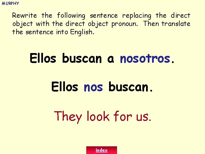 MURPHY Rewrite the following sentence replacing the direct object with the direct object pronoun. Then translate the sentence into English. Ellos buscan a nosotros. Ellos nos buscan. They look for us. index