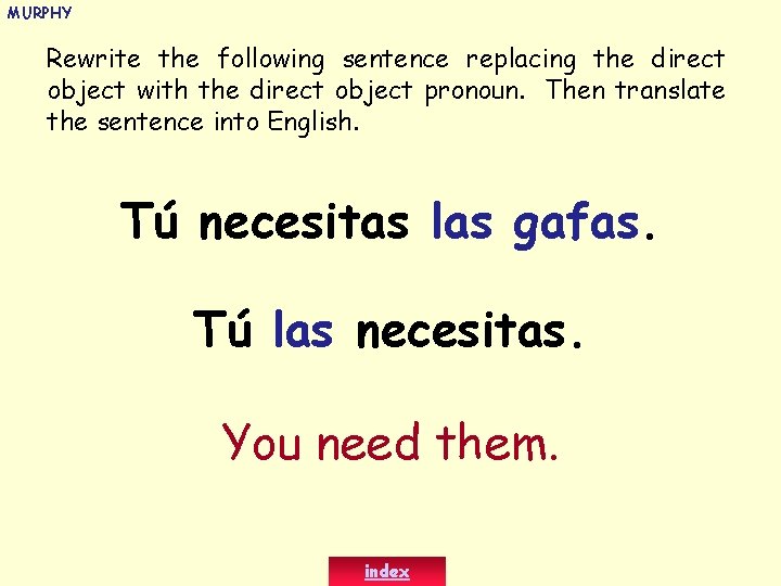 MURPHY Rewrite the following sentence replacing the direct object with the direct object pronoun. Then translate the sentence into English. Tú necesitas las gafas. Tú las necesitas. You need them. index