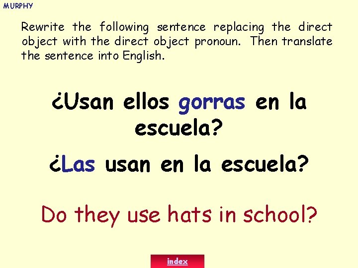MURPHY Rewrite the following sentence replacing the direct object with the direct object pronoun. Then translate the sentence into English. ¿Usan ellos gorras en la escuela? ¿Las usan en la escuela? Do they use hats in school? index