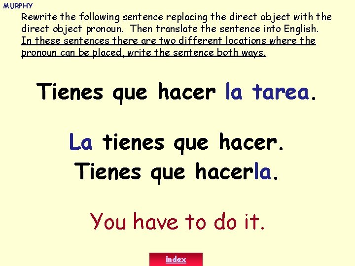 MURPHY Rewrite the following sentence replacing the direct object with the direct object pronoun. Then translate the sentence into English. In these sentences there are two different locations where the pronoun can be placed, write the sentence both ways. Tienes que hacer la tarea. La tienes que hacer. Tienes que hacerla. You have to do it. index