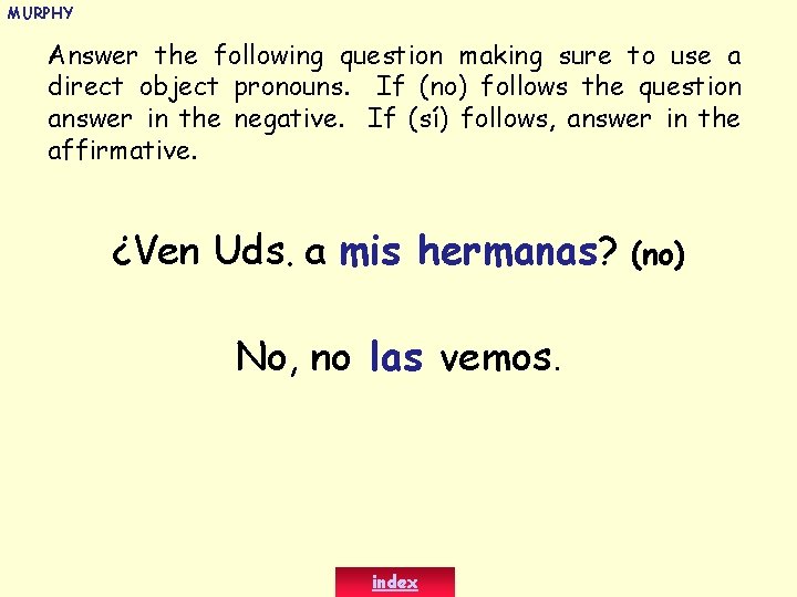 MURPHY Answer the following question making sure to use a direct object pronouns. If (no) follows the question answer in the negative. If (sí) follows, answer in the affirmative. ¿Ven Uds. a mis hermanas? (no) No, no las vemos. index