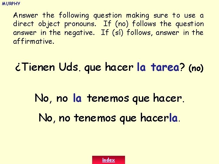 MURPHY Answer the following question making sure to use a direct object pronouns. If (no) follows the question answer in the negative. If (sí) follows, answer in the affirmative. ¿Tiene que hacer la tarea? (no) No, no la tenemos que hacer. No, no tenemos que hacerla. index