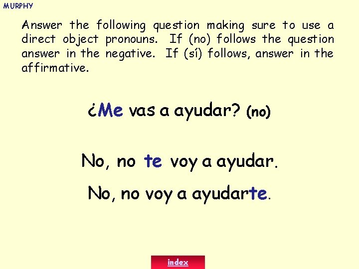 MURPHY Answer the following question making sure to use a direct object pronouns. If (no) follows the question answer in the negative. If (sí) follows, answer in the affirmative. ¿Me vas a ayudar? (no) No, no te voy a ayudar. No, no voy a ayudarte. index