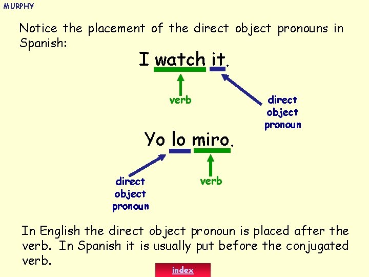 MURPHY Notice the placement of the direct object pronouns in Spanish: I watch it. verb Yo lo miro. direct object pronoun verb direct object pronoun In English the direct object pronoun is placed after the verb. In Spanish it is usually put before the conjugated verb. index
