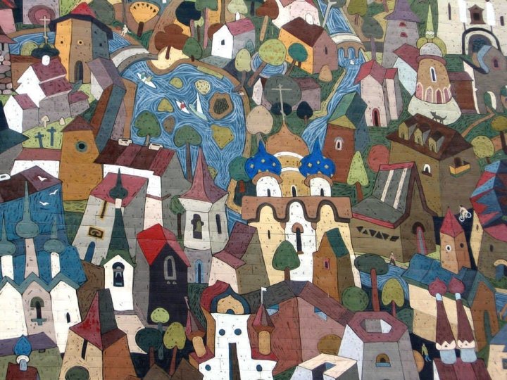 Lyon 4ème MUR DES CANUTS angle bd des Canuts et rue Denfert-Rochereau Sur 1200 m², trompe-l’oeil sur l'ambiance et la vie du quartier, typiques du plateau de la Croix-Rousse, ses maisons, ses escaliers, castelet de Guignol au rez-de-chaussée + un Guignol géant porté par un groupe de jeunes. Réalisé par la CITE DE LA CREATION en 1987, réactualisé en 1997