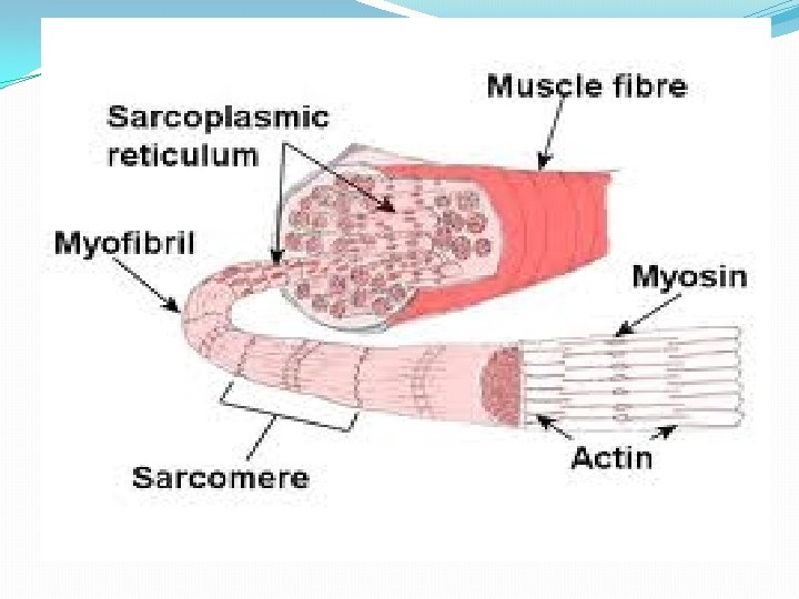 Structure of a Muscle �Skeletal muscle is made up of bundles of muscle fibres. �Fibres are bound together by connective tissue through which run blood vessels and nerves. �Each muscle fibre contains: v Numerous myofibrils, v Many mitochondria, v An extensive network of interconnecting tubes called the sarcoplasmic reticulum, v Many nuclei.