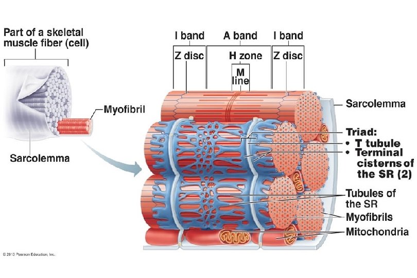 Sarcoplasmic Reticulum • smooth endoplasmic reticulum of muscle cells • storage area for Ca ions • At H zones and A - I junctions tubes fuse and form lateral channels - terminal cisternae which feed into transverse tubules (T tubules) tubules at each Z line. • T tubules receive nerve stimuli and provide a pathway for oxygen, glucose, and Ca ions. (because continuous with membrane, nerve impulse allowed deep into muscle)