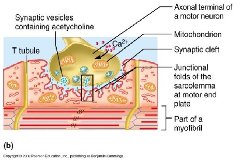 Regulation of Contraction • In order for a nerve impulse to trigger a muscle response, the impulse must travel over the gap (neuromuscular junction) junction where two cells meet. (neuron and muscle) • In the gap (extracellular space = synapse) synapse are sacs containing the neurotransmitter - acetylcholine (Ach).