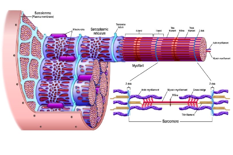 Connective Tissue Epimysium Perimysium Endomysium surrounds Structure Gross muscle Fascicle (bundles of cells) Muscle fiber (muscle cell) organ tissues cells Myofibril organelles Myofilaments molecules (contracting organelle) Actin – thin filament Myosin – thick filament