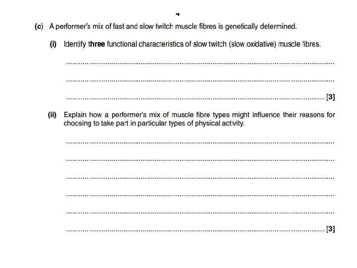 Muscle Fibre Types TASK Cut out/ print out pictures of different types of performers. Stick them in and under each picture make a prediction of the relative percentages of the three types of muscle fibre in specific skeletal muscles. Justify your answer by using your knowledge of the structural and functional characteristics of muscle fibres. Athlete Gender Muscle Slow Twitch % Fast Twitch % Sprinters M Gastrocnemius 24% 76% 27% 73% 79% 21% 69% 31% F Distance runners M F Gastrocnemius