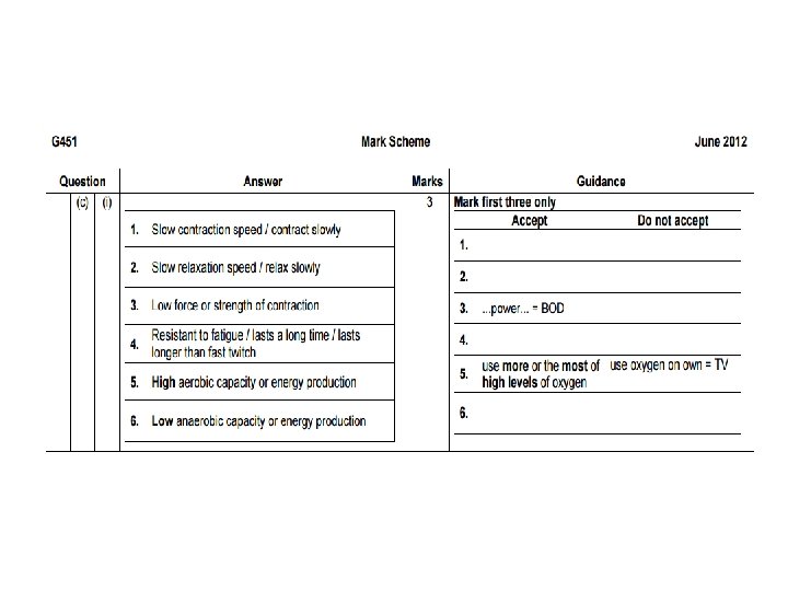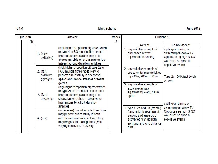Characteristics Fibre size Number of mitochondria Number of capillaries Myoglobin content PC stores Glycogen stores Triglyceride stores Speed of contraction Force of contraction Resistance to fatigue Aerobic capacity Anaerobic capacity Slow Twitch (Type 1) MARATHON Fast Oxidative Glycolytic (Type 2 a/ FOG) 800 M Fast Glycolytic (Type 2 b/ FG) SPRINT HURDLES