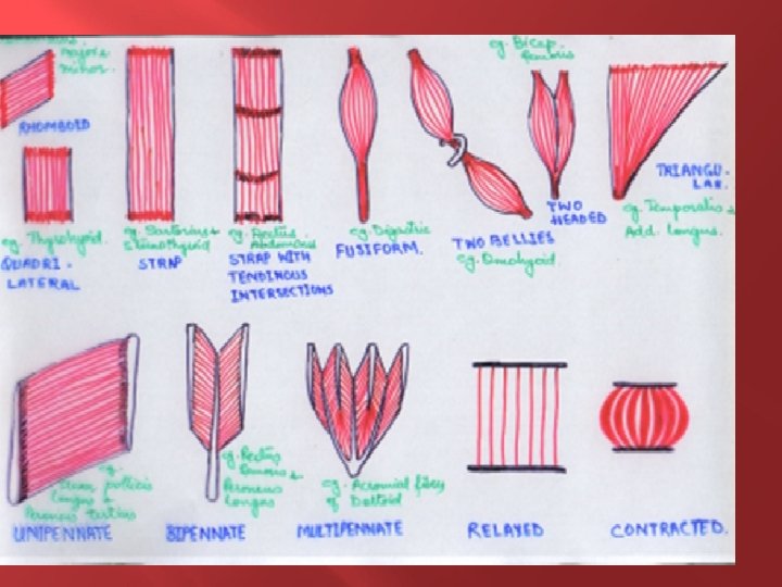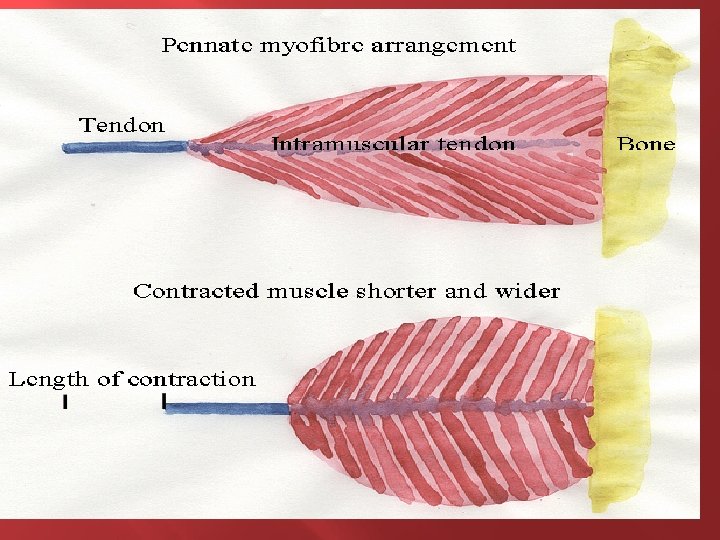 ARCHITECTURAL CLASSIFICATION Pennate muscles fibers run obliquely to line of pull On basis of shape