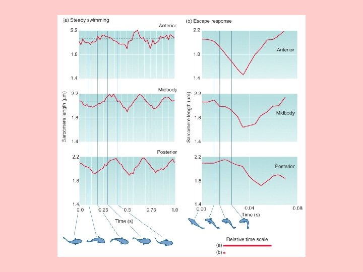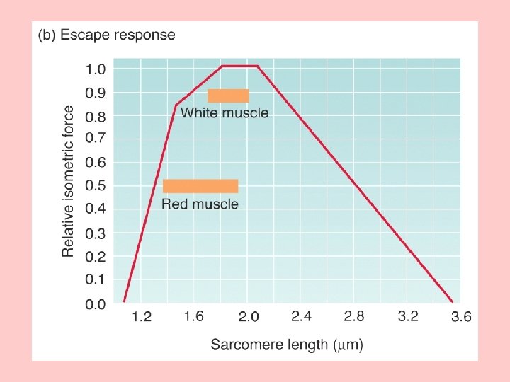 In steady swimming, red muscle shortens to between 1. 89 to 2. 25 um at the top of the force curve. But because of their attachment, they would need to shorten to 1. 4 um in an escape response.