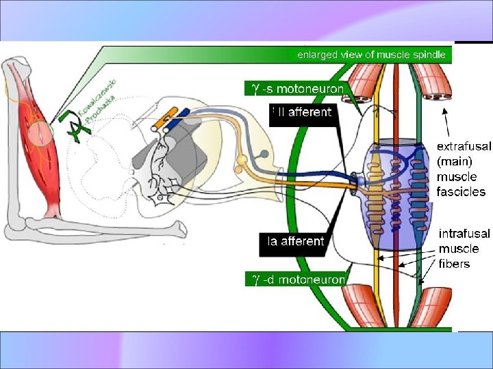 Anatomy • Found within the belly of muscles embedded in extrafusal muscle fibers • Muscle spindles are composed of 312 intrafusal fibers • Encapsulated by connective tissue, and are aligned parallel to extrafusal muscle fibers