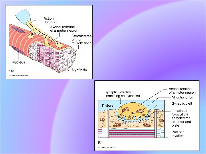 Muscle Contraction • Nerve impulse reaches myoneural junction • Acetylcholine is released from motor neuron • Ach binds with receptors in the muscle membrane to allow sodium to enter • Sodium influx will generate an action potential in the sarcolemma