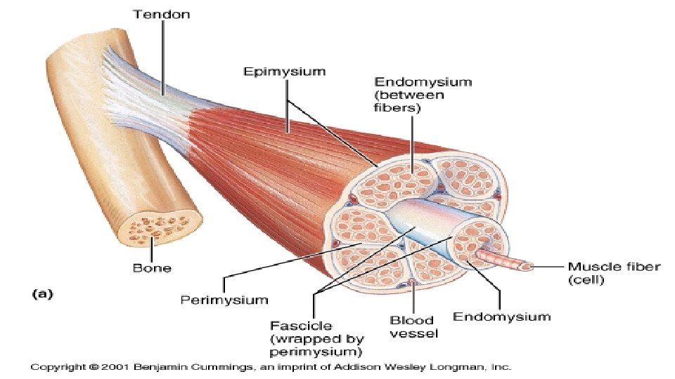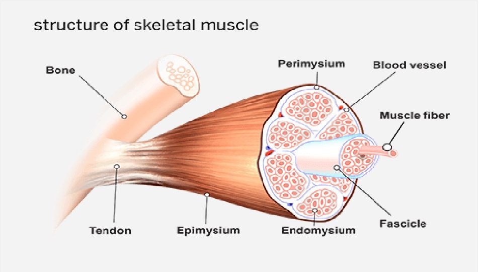 Skeletal Muscle Connective tissue 1. Fascia (fibrous connective tissue under skin or around organs) superficial / under skin deep -- endomysium (fascia around a single muscle fiber) perimysium (fascia around a bunch of muscle fibers) epimysium (fascia around the entire muscle)