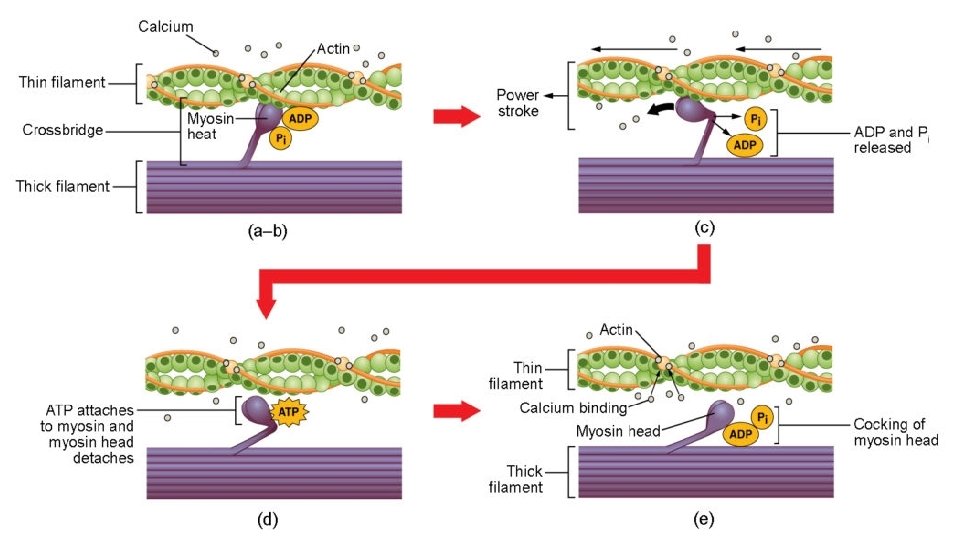 6. Muscle contraction usually stops when signaling from the motor neuron ends, which repolarizes the sarcolemma and T-tubules, and closes the voltage-gated calcium channels in the SR. Ca++ ions are then pumped back, using ATP, into the SR, which causes the tropomyosin to reshield (or re-cover) the binding sites on the actin strands.