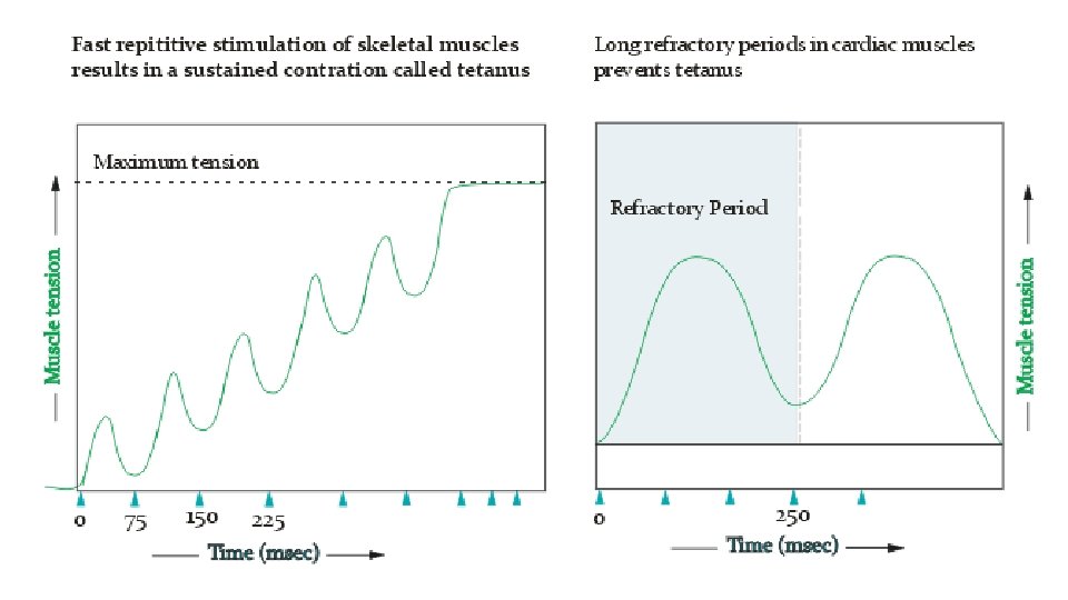 2. Tetanus - a sustained contraction or short relaxation period. Comes from multiple action potentials arriving near the end of, or after the refractory period. Most voluntary movements are of this type