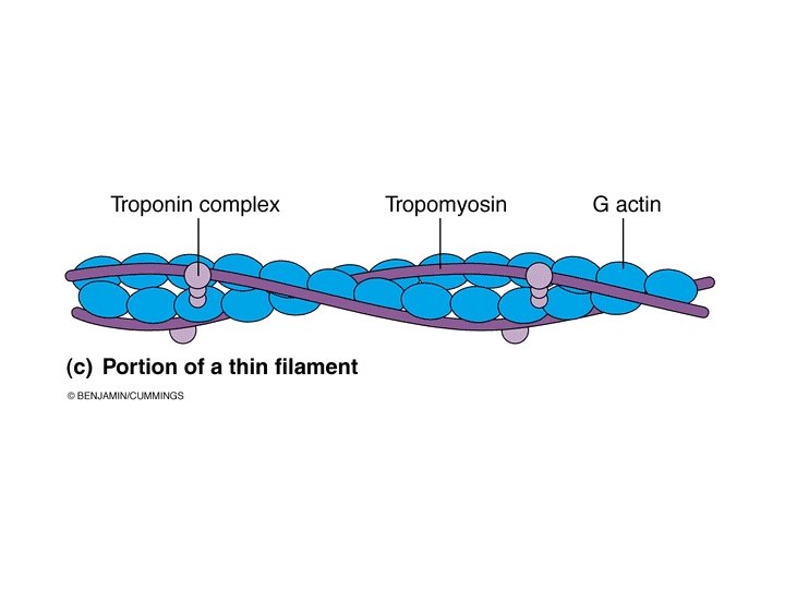 Muscle Contraction Continued • Action potential travels down T tubule • Sarcoplamic reticulum releases calcium • Calcium binds with troponin to move the troponin, tropomyosin complex • Binding sites in the actin filament are exposed