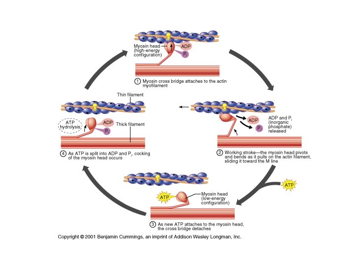 Muscle Contraction Continued • Myosin head attach to binding sites and create a power stroke • ATP detaches myosin heads and energizes them for another contaction • When action potentials cease the muscle stop contracting