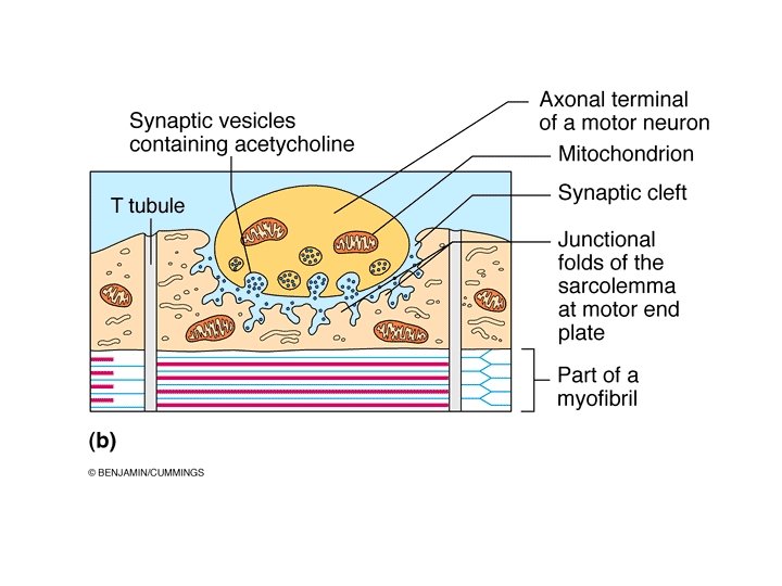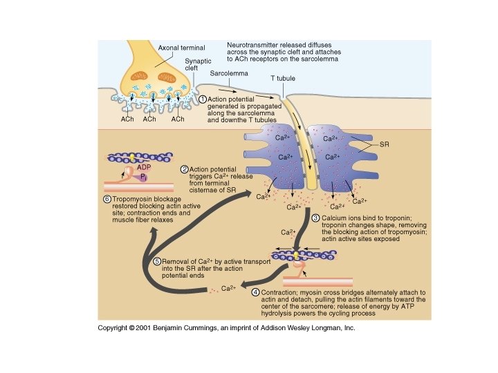 Muscle Contraction Summary • Nerve impulse reaches myoneural junction • Acetylcholine is released from motor neuron • Ach binds with receptors in the muscle membrane to allow sodium to enter • Sodium influx will generate an action potential in the sarcolemma