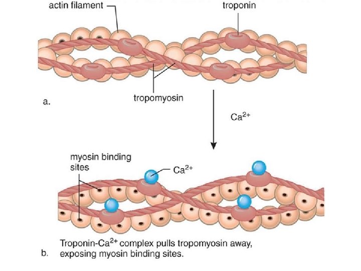 Actin structure • Formed by 3 different proteins: - globular (G) actins: bind to myosin heads - tropomyosin: long, fibrous molecule, extending over actin, and preventing interaction between actin and myosin - troponin: binds reversibly to calcium and able to move tropomyosin away from the actin active site Figure 12. 4