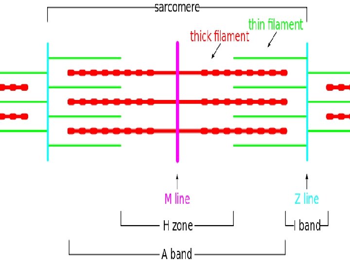 • Sarcomere- between two z-lines. Basic unit of muscle • Cross striations due to alternate dark and light bands • Light band - Isotropic band - I band - Thin filaments • Dark band - Anisotropic band - A band - Thick filaments • H zone - lighter zone in A band • Z line - in the center of I band • M line - in the center of A band