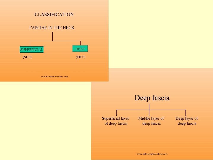 SUPERFICIAL CERVICAL FASCIA Subcutan connective tissue and the platysma only DEEP CERVICAL FASCIA : spf layer (investing layer) pretracheal layer prevertebral layer