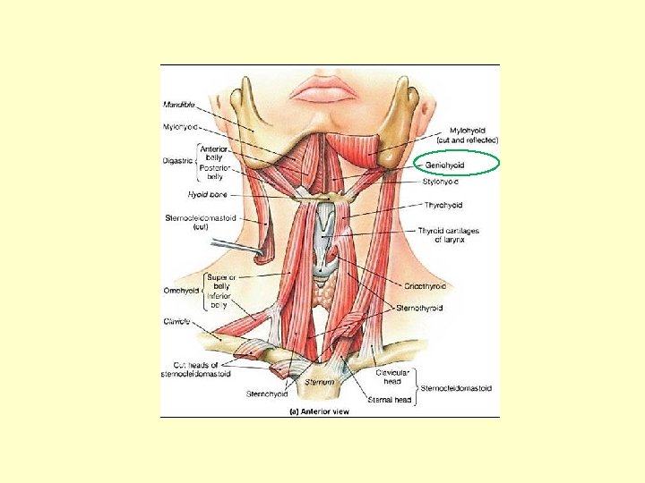 Suprahyoid muscles origin insertion (1) m. mylohyoid N. V/3 Mylohyoid line of mandibule Mylohyoid raphe and body of hyoid bone (2) m. digastric Anterior belly - inner side of the mentum Tendon is connected to the hyoid bone /N. V/3 Posterior belly - mastoid process /N. V II (3) m. stylohyoid N. VII Styloid process (4) m. geniohyoid N. XII Hyoid bone Body and greater horn of the hyoid bone around the tendon of the digastric Body of hyoid bone Inner side of the mentum (genu of mandible) The suprahyoid muscles are a group of four muscles, located superiorly to the hyoid bone of the neck. They all act to elevate the hyoid bone – an action involved in swallowing, sucking, drinking, opening of mouth.