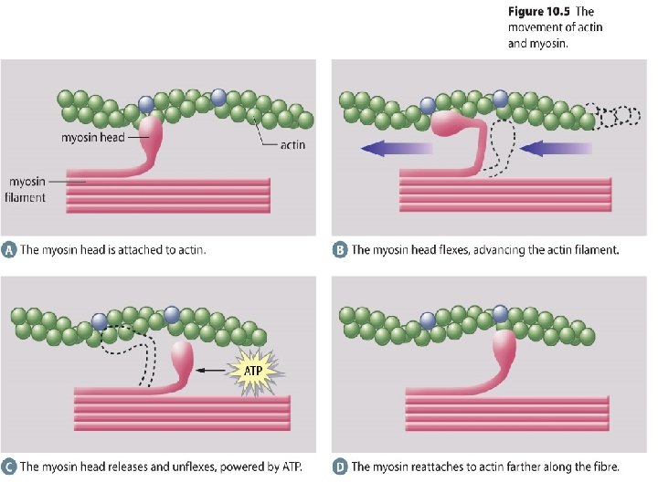 Use Figure 10. 5 to follow along the Sliding Filament Model � A – myofilament contracts of the myosin moves bending up and towards the rod. The heads are now chemically bonded to the actin myofilament � � B – the actin is pulled along as the myosin head bends and the actin slides past the myosin � � C - ATP is used to unbond the myosin and actin and reposition the myosin � � D - Myosin head rebonds with actin further down the fibre.