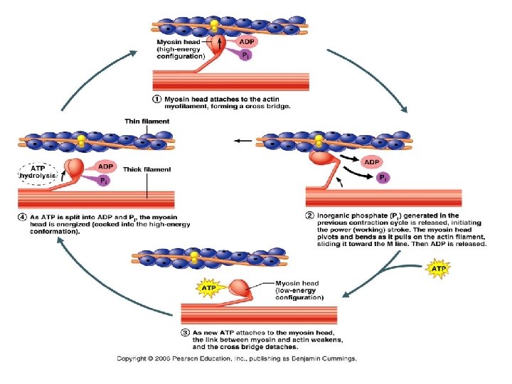 Sliding Filament Theory • Order the following events in sequence to explain the contraction of skeletal muscle. • ____ Ca+2 binds to troponin/tropomyosin (regulatory proteins) which opens myosin binding sites on actin. • ____ As ADP and P leave the myosin head, it swivels forward pulling the actin filament toward the center of the sarcomere. The sarcomere shortens. • ____ An action potential moving through the sarcolemma (what is this? ) stimulates release of Ca+2 from the sarcoplasmic reticulum. (what is this? ) • ____ Myosin heads (activated by the breakdown of ATP) bind to exposed sites on the actin filament. • ____ ATP binds to the myosin head and it relaxes, falling away from the actin filament. • _____ Cycle repeats until Ca 2+ or ATP are withdrawn.