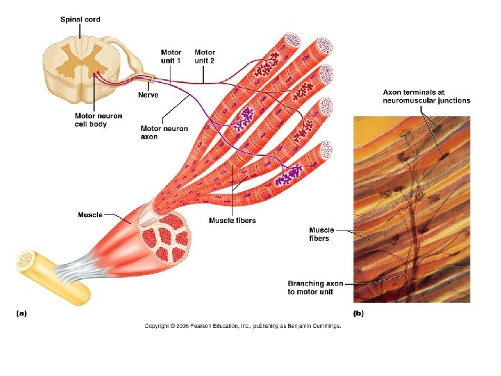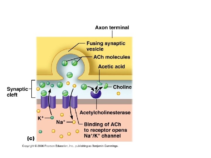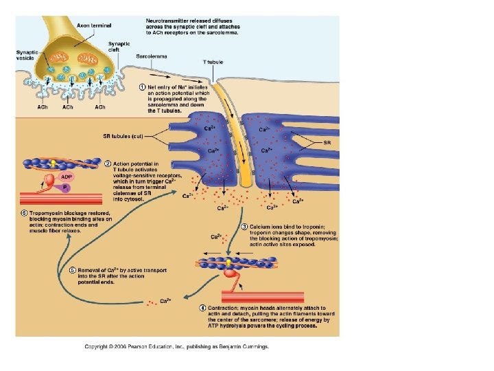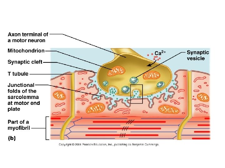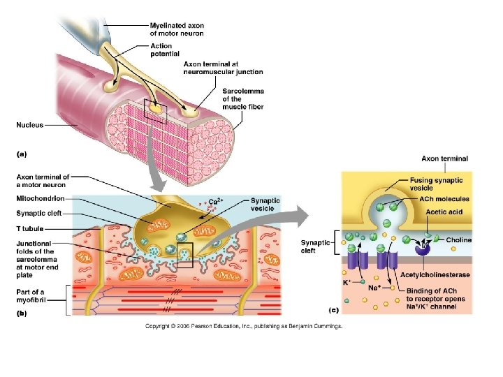 Events at Neuromuscular Junction 1. 2. 3. 4. 5. 6. Action potential in the nerve is activated Ca 2+ runs into the nerve Ach is released into the synaptic cleft Ach binds to receptors on the muscle Na runs into the muscle Action potential runs across the muscle and into the T tubules 7. Enzymes break Ach into Acetic Acid and Choline